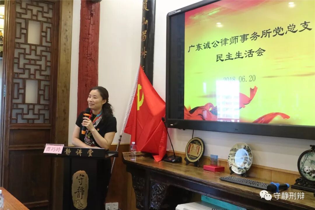 为庆祝中国共产党成立97周年,引导广大基层党组织和党员继承和发扬党的光荣传统,2018年6月20日下午,中共广东诚公律师事务所党总支在广东守静律师事务所中和堂召开2018季度民主生活会。党总支书记陈亚莉、副书记吴昊、第三支部书记商伟峰、广东守静律师事务所党支部书记赵航与工青妇委员曹巧玲同志等众多党员律师参与了本次民主生活会。我所党支部书记赵航主持本次会议。